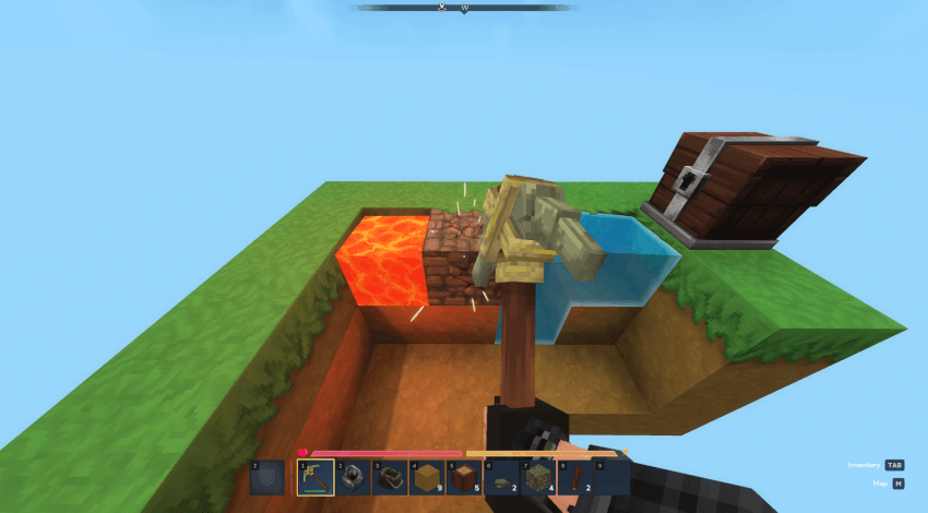 Cuando empieces, construye una pequeña plataforma de tierra alrededor del árbol para atrapar cualquier objeto que de otro modo caería al vacío, ¡y luego adelante, golpea ese árbol!