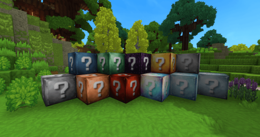 11+ Bloques de Suerte Únicos: ¡El mod añade bloques de suerte distintos! Cada uno ofrece su propia tabla de botín temática repleta de sorpresas, desde comunes básicas hasta ultra raras.