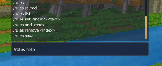 /rules/rules reload/rules list/rules set <índice> <texto>/rules add <texto>/rules add "No griefing ni robo a otros jugadores"/rules remove <índice>/rules save(El contenido se ampliará en futuras actualizaciones)