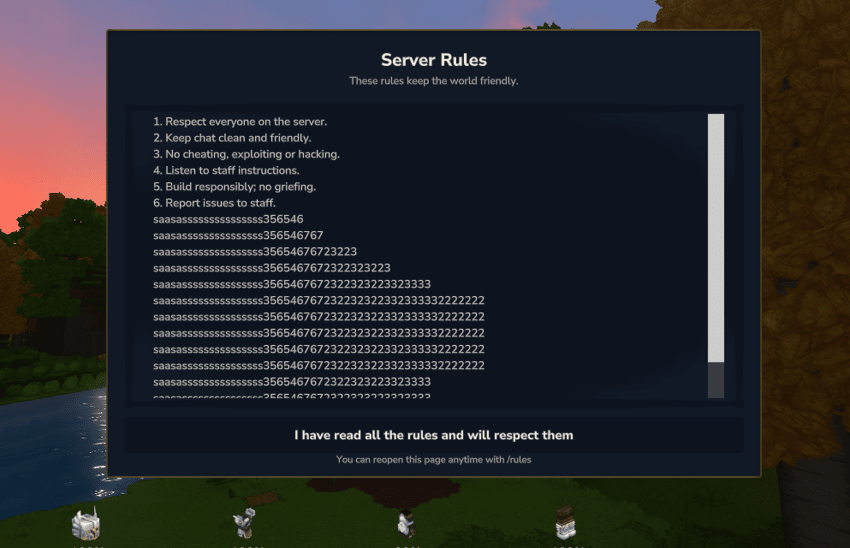 Las reglas pueden ser mostradas a los jugadores en un formato claro, asegurando que todos comprendan y sigan las directrices del servidor.