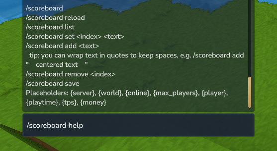 /scoreboard/scoreboard reload/scoreboard show/off/scoreboard list/scoreboard set <índice> <texto>/scoreboard add <texto>/scoreboard add " texto centrado "/scoreboard remove <índice>/scoreboard save