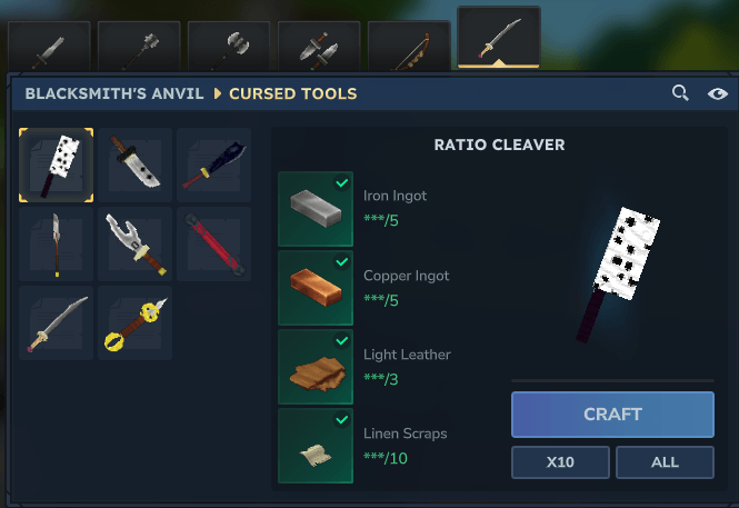 Cada herramienta maldita puede ser forjada en el yunque del herrero en la pestaña de Herramientas Malditas. Algunas herramientas malditas se forjarán con materiales atípicos para mantener la elaboración interesante y divertida.