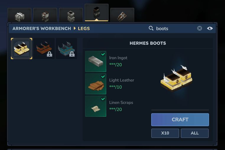 Las diferentes botas son todas elaboradas a mano a través de la Mesa de Trabajo de Armaduras con diferentes materiales de Hytale Vanilla.