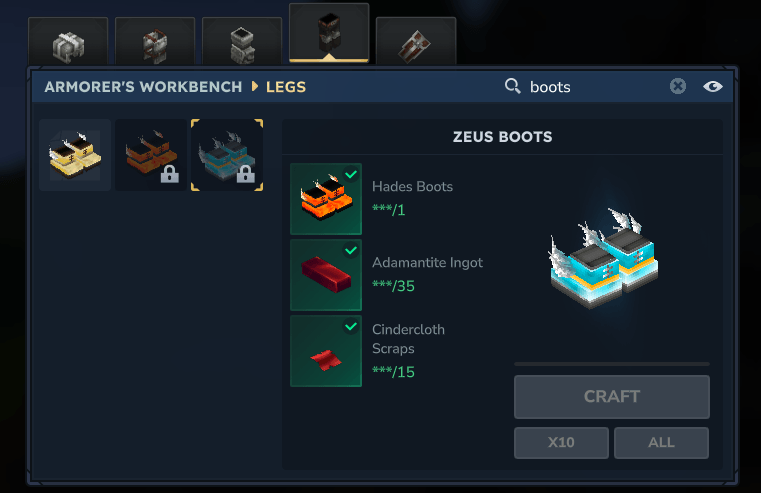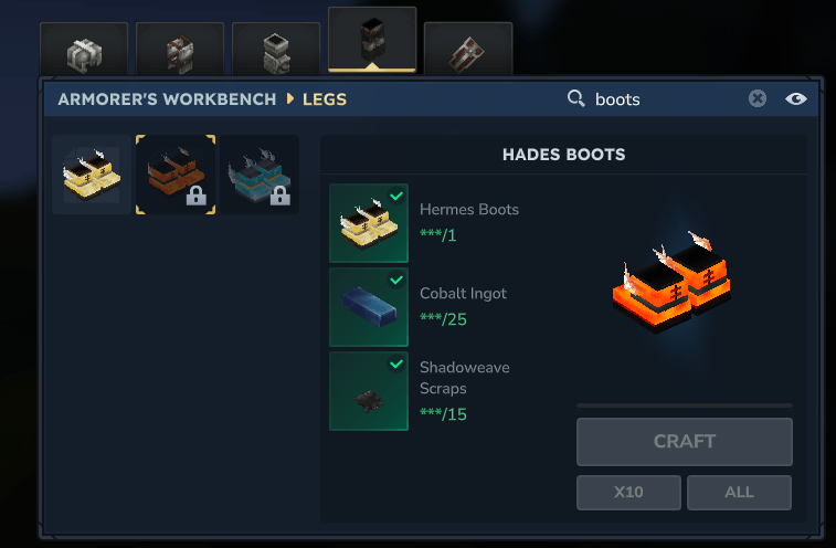 Estamos al tanto de un error visual donde las botas aparecen incorrectamente en la vista de la pestaña de Personaje y en la interfaz de elaboración de la Mesa de Trabajo de Armaduras. Estamos trabajando activamente en solucionar esto en futuras actualizaciones, ¡y cualquier ayuda es bienvenida!