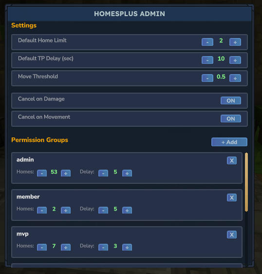 home.delay.member – 4 segundoshome.delay.vip – 3 segundoshome.delay.vipplus – 2 segundoshome.delay.mvp – 1 segundohome.delay.mvpplus – 0 segundos (instantáneo)home.delay.admin – 0 segundos (instantáneo)¡Puedes añadir tus propios nodos de permiso personalizados A TRAVÉS de la ‘interfaz gráfica de /homes admin’ o en el archivo de configuración!