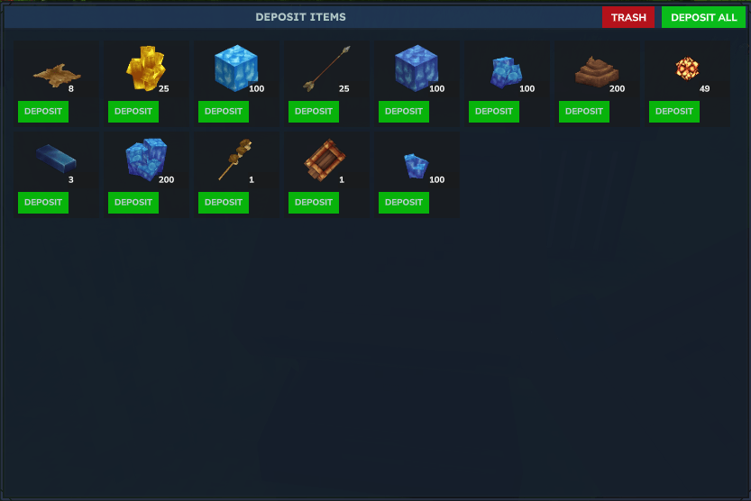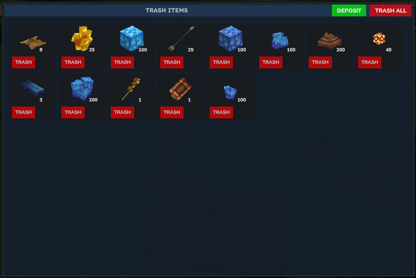 Este plugin añade una interfaz gráfica de usuario (GUI) a Hytale para realizar depósitos automáticos inteligentes en cofres cercanos o eliminar tu botín. Cuando accedes al menú, tienes la opción de depositar automáticamente los objetos de tu inventario en cualquier cofre dentro de un radio de un bloque (el valor predeterminado es 15). Consultará los cofres a tu alrededor e intentará añadir el objeto a los cofres que ya tengan ese objeto. Si no puede encontrar un cofre con ese objeto o no hay espacio en un cofre que contenga ese objeto, elegirá un cofre al azar. Hay otra opción en la parte superior de la GUI para eliminar objetos, que reemplaza cada botón de depósito por un botón de basura y eliminará objetos de tu inventario. Todas las transacciones se registran en el chat, así que sabrás qué ha pasado con tus objetos.