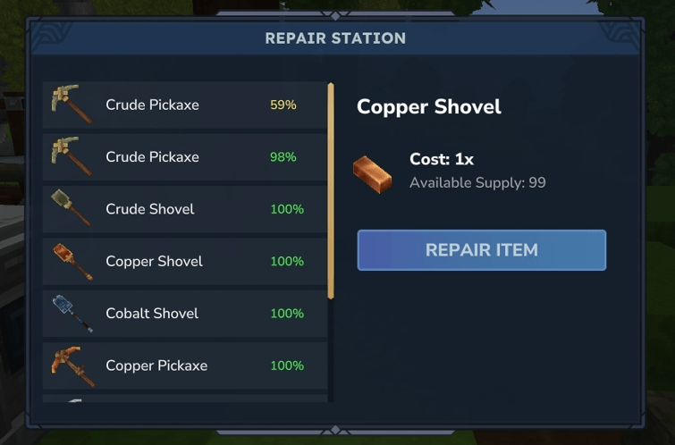 /repair en el chat.Actualmente, puedes reparar Espadas, Picos, Hachas y Palas fabricadas con los siguientes materiales: