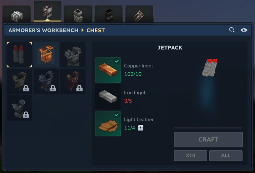 Tuve que tomar algunas decisiones de diseño menos que satisfactorias debido a limitaciones del motor. Actualmente, no es posible obtener entradas de usuario arbitrarias, por lo que el jetpack DEBE funcionar al agacharse. Los mods solo pueden obtener un conjunto definido de acciones del usuario (es decir, caminar, saltar, agacharse), y en este caso, no pude hacer que el jetpack funcionara cuando el usuario está saltando porque los jugadores solo