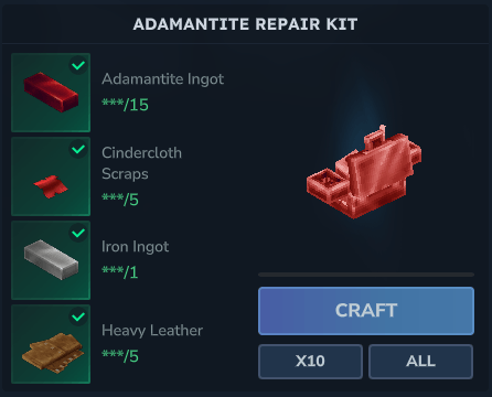 El Kit de Reparación de Adamantita repara herramientas, armas y armaduras con una ganancia de durabilidad de hasta el 10% del máximo.