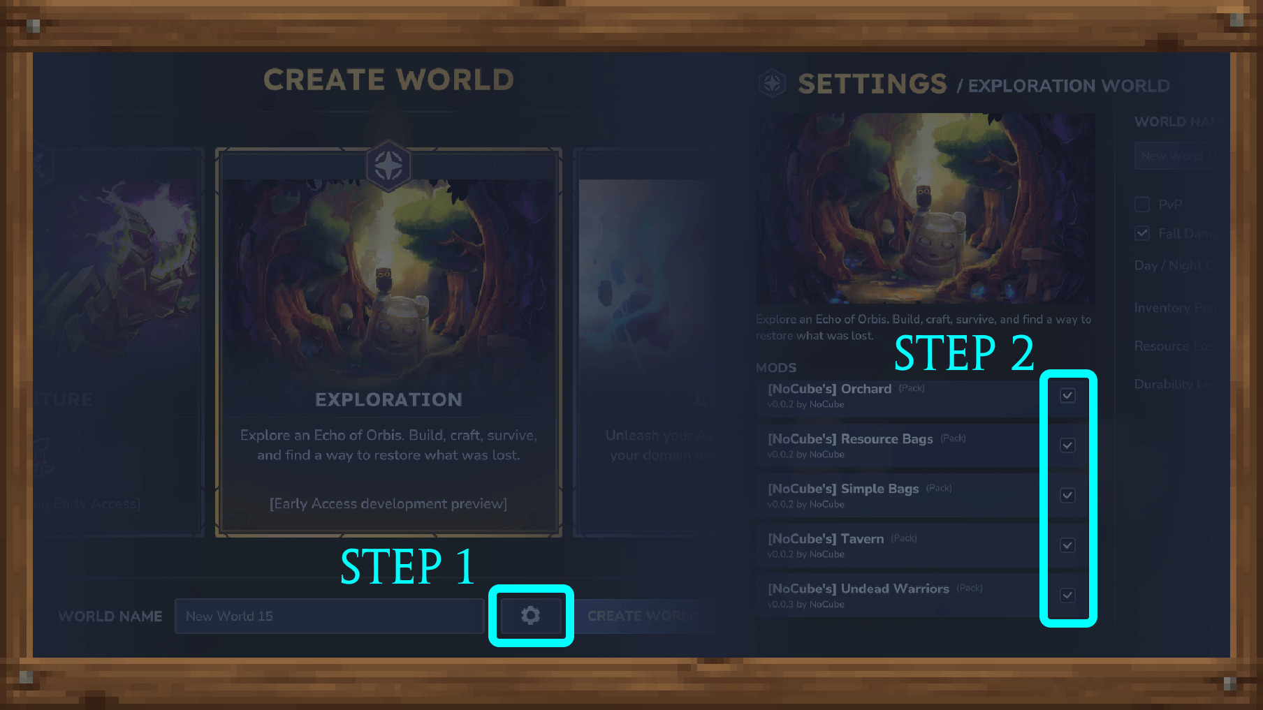 Después de descargar la mod, asegúrate de ir a Configuración del Mundo (Paso 1) y marcar las casillas junto a las mods deseadas