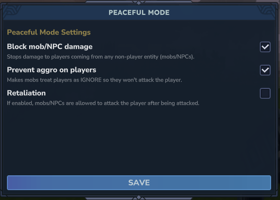 Agrega esto a tu mundo para evitar que todos los mobs te ataquen o te hagan daño, similar al modo pacífico de Minecraft, pero la diferencia es que este modo no impide que aparezcan mobs hostiles, ya que las caídas de objetos podrían ser útiles.