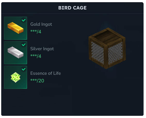 La Jaula para Aves es una Caja de Captura especializada enfocada en capturar aves. Se fabrica en el Banco de Trabajo del Granjero por 4 Barras de Oro, 4 Barras de Plata y 20 Esencias de Vida. A diferencia de las otras Cajas, la Jaula para Aves solo puede capturar lo siguiente: