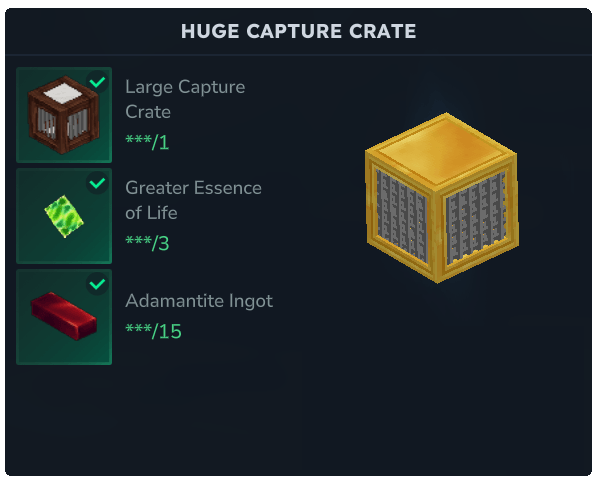 La Enorme Caja de Captura puede contener animales y mobs mucho más grandes, incluidos algunos animales agresivos. Se desbloquea en el Nivel 3 en el Banco de Trabajo del Granjero y se puede fabricar con 1 Gran Caja de Captura, 3 Esencias de Vida Concentrada y 15 Barras de Adamantita. Además de la Gran Caja de Captura, la Enorme Caja de Captura puede contener lo siguiente: