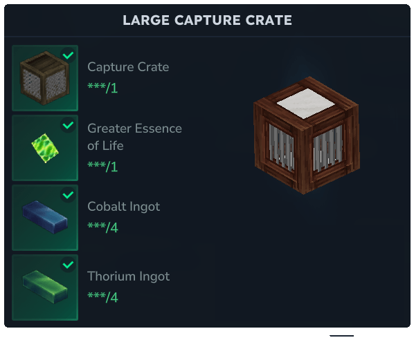 La Gran Caja de Captura se puede fabricar en el Banco de Trabajo del Granjero a cambio de 1 Caja de Captura, 1 Esencia de Vida Concentrada, 4 Barras de Cobalto y 4 Barras de Torio. Puede capturar todos los mismos animales que la caja estándar con la adición de los siguientes: