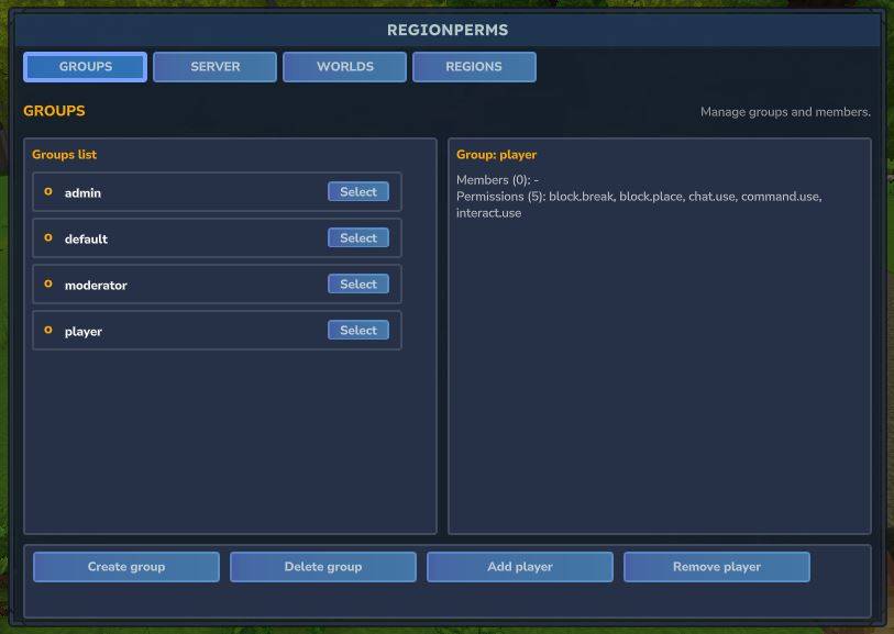 RegionPerms incluye una GUI en el juego dedicada que permite a los administradores gestionar todo sin editar archivos o reiniciar el servidor.