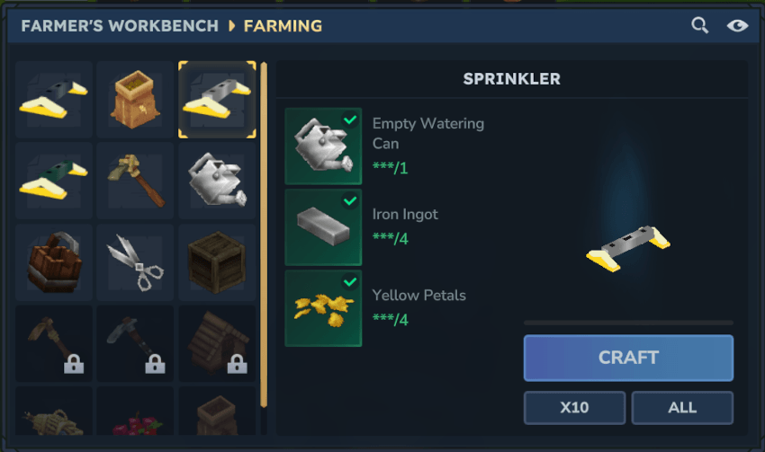 Los aspersores añaden riego automatizado a Hytale, facilitando el mantenimiento de tus granjas de forma saludable y productiva. Coloca un aspersor sobre una fuente de agua y este hidratará periódicamente el suelo cultivado cercano, eliminando la necesidad de regar manualmente.