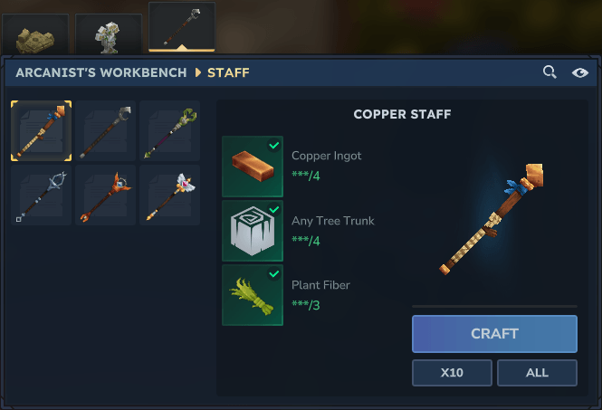 El bastón se elabora en el banco de trabajo del arcanista. Cada bastón dispara un proyectil verde.