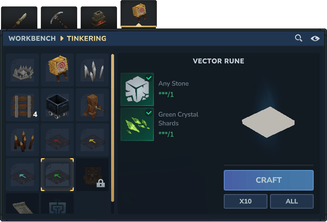 Las runas vectoriales se fabrican utilizando piedra y fragmentos de cristal verde. Puedes encontrar los fragmentos mientras minas y exploras el mundo. ¡Puedes mejorar el bloque utilizando cristales de diferentes colores, como amarillo, rojo y azul!